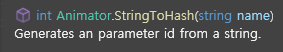 Animator Class에 있는 메서드로 애니메이션의 파라미터의 이름(문자열)을 해시값으로 변경하여