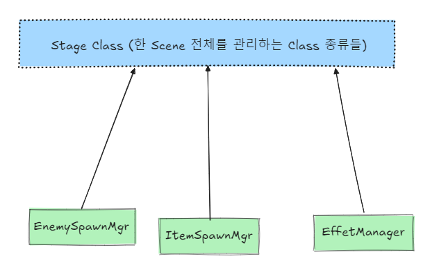 ex) EnemyManager는 적만 관리/생성 하는 클래스인데 아이템드랍,적 파괴시 이펙트 효과 등 이벤트를 적용시키려다 보니 ItemManager와 EffectManager가 참조 되있는 경우