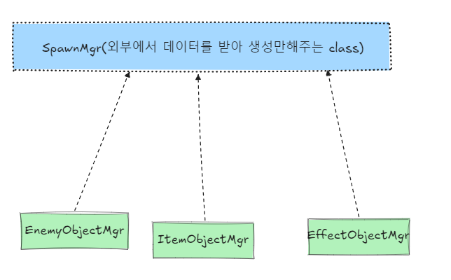 2.이 방법은 해당 기능을 따로 class로 만들고 데이터를 보관하고 있는 컨테이너 클래스로 만들어 필요할떄마다 해당 클래스를 호출하여 쓰는 방법이다. 예시로 SpawnManager로 객체들을 생성하는 기능을 하나의 Class로 만들고 오브젝트 관리하는 Class를 만들어 해당 Class에서는 오브젝트 풀링처럼 객체의 data(prefab)만 꺼내서 전달해주는 방식이다.