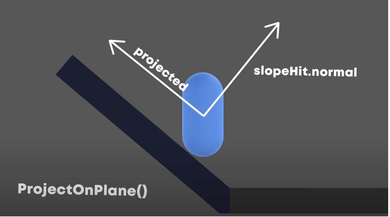 ProjectOnPlane() 메서드를 사용하여 내가 이동하는 방향벡터 movediretion 과 경사도의 법선벡터 slopeHit.normal의 투영 벡터를 구해야만 해당 경사도에서의 이동 방향을 구 할수 있게된다.