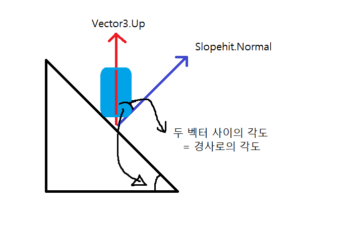 그러기위해서 경사면의 노말벡터(법선벡터,Slopehit.Normal) 과 윗 방향의 벡터(Vector3.up) 사이의 각도를 구한뒤에 넘어갈수 있는 각도인지 체크한다.