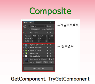 Unity에서 GameObject의 Inspector에 들어가는 다양한 컴포넌트들이 Composite 패턴입니다. GameObject는 여러 컴포넌트를 가질 수 있으며, 각각을 독립적으로 관리하면서도 GameObject 하나에 모두 붙일 수 있습니다. GameObject는 복합 객체로, 각 컴포넌트는 단일 객체로 작동하며, 둘 모두 동일한 방식으로 조작됩니다.