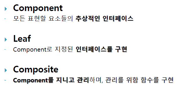 이 패턴은 객체들을 트리 구조로 구성하여, 부분-전체 계층 구조를 표현할 수 있습니다.