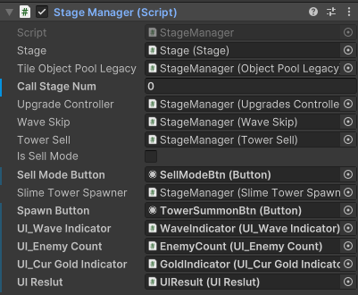StageManager의 Inspector에서 보면 밑에 컴포넌트로 부착한것들을 전부 등록하여 사용하고있다.