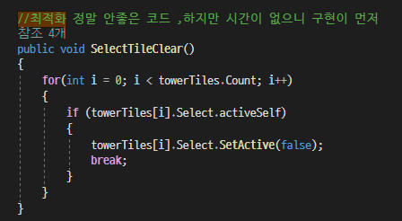 타일을 선택할떄마다 타일 선택 정보를 초기화 해주는 코드인데 맨처음 작성시 자료구조를 List를 쓴것부터가 문제의 시작이였고 해당 문제를 해결하려면 TowerTiled을 딕셔너리로 변경해서 사용할수있게 구조를 바꿧어야 했다.