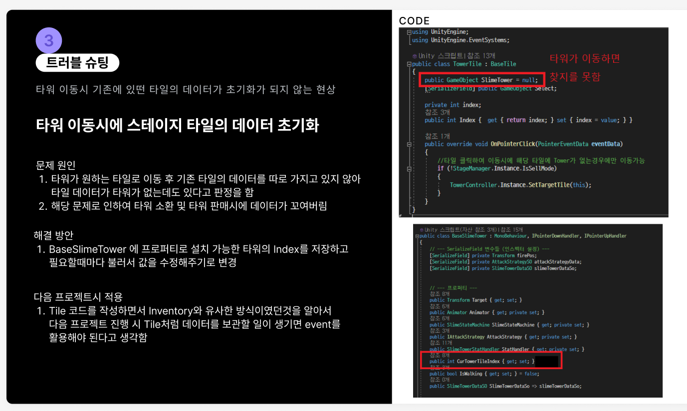 <타워 이동시 기존에 있던 타일 데이터가 초기화 되지 않는 이슈> 가 있었는데 , 발표 자료에만 작성이 되어있어
