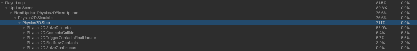 튀는 곳의 수치를 확인해보면 Bodies 61개인데 ,Physics2D 충돌이 3620번이 찍혔다.