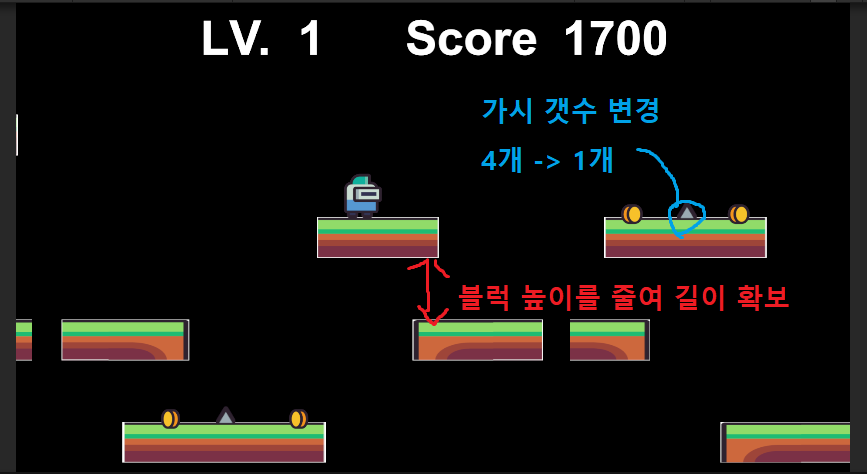 각 블럭의 높이를 줄여 공간을 확보 하였고 , 가시의 갯수가 많아 게임이 너무 어려워 1개로 듬성듬성 배치하기로 함