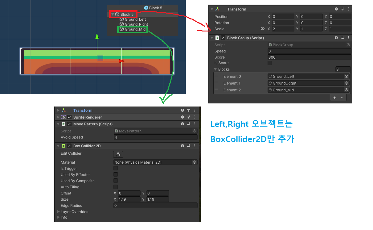 각 블럭마다 콜리더를 추가하였고 기믹이 필요한곳에만 스크립트(MovePattern.cs , DropPattern.cs)를 넣어서 사용 하였고 3개의 블럭은 동시에 같은속도로 같이 이동해야 되기때문에