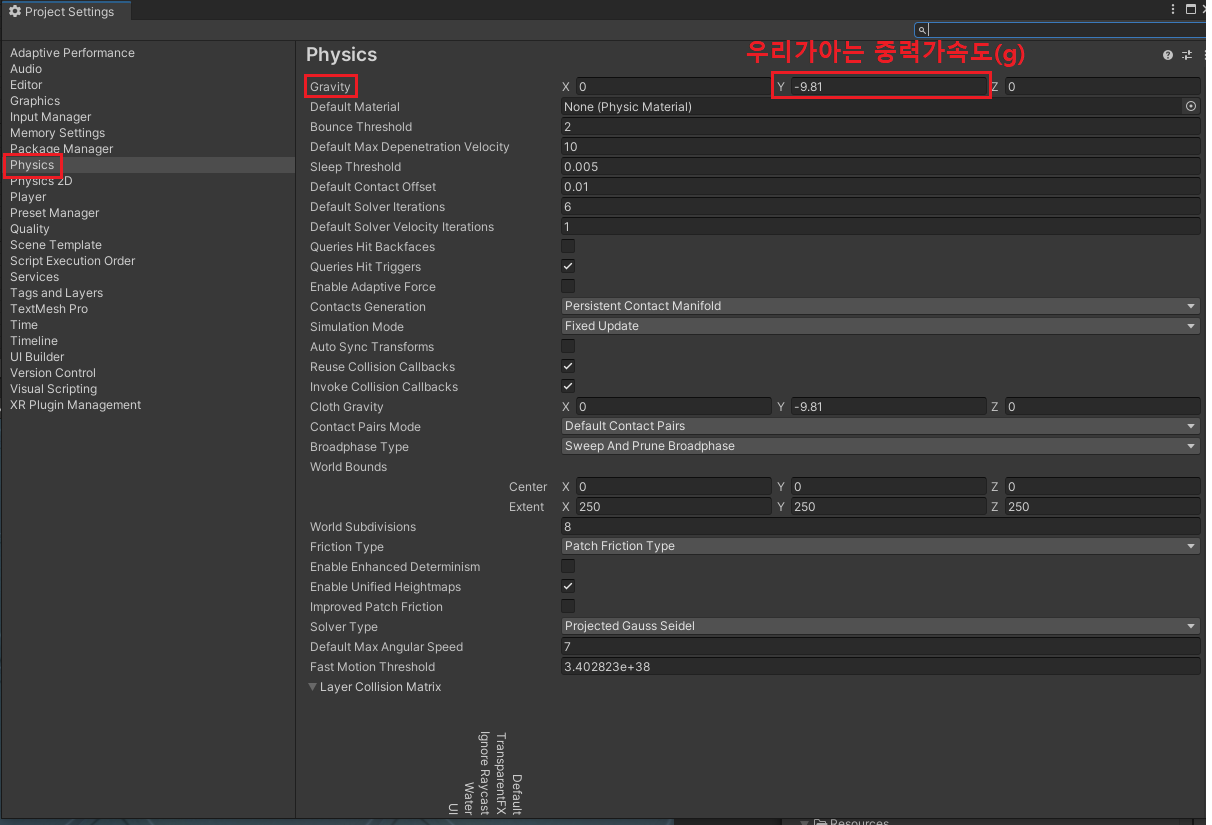 오브젝트의 RigidBody 를 건드는것이 아닌 ProjectSetting의 중력 값을 조절하면된다.