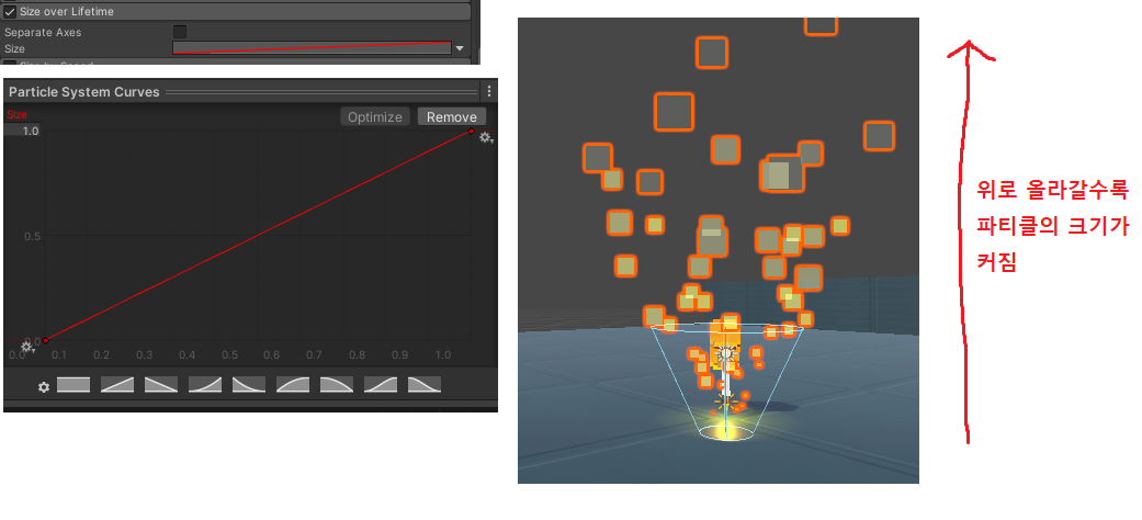 Unity에서 제공하는 프리셋이 있어 그걸 사용해도 된다. 위의 이미지 처럼 위로 올라갈수록 파티클의 크기가 커지는 모습을 볼 수있다.