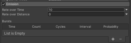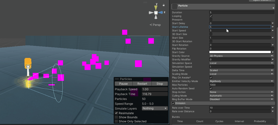 Emission(방출)은 파티클의 갯수에 영향을 준다. Time의 숫자가 커질수록 파티클의 갯수가 증가한다.