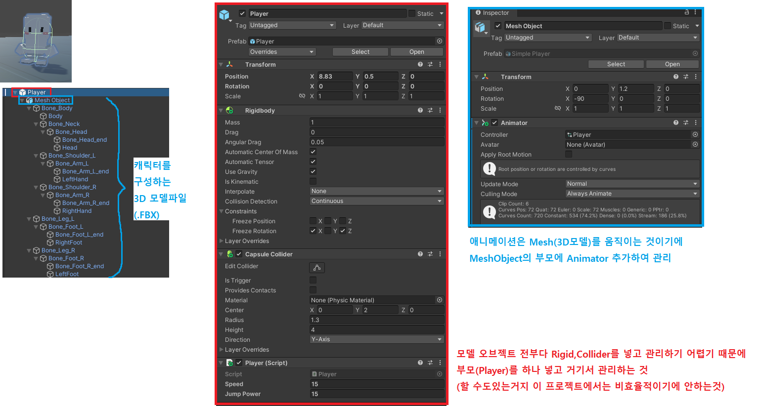 2.Mesh Object는 캐릭터의 모습을 보여주는 기능이기에 따로 자식으로 뺸뒤 Animator 컴포넌트를 추가하여 캐릭터의 모습에 애니메이션을 추가하는 기능까지 부여하였고