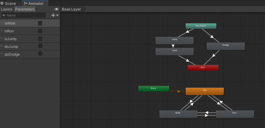 일회성 애니메이션(점프,회피)은 Trigger 파라미터를 사용한다.