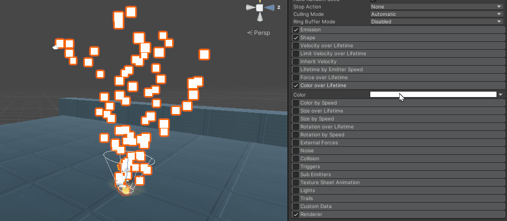Color over LifeTime 은 파티클의 색상을 결정하는 기능이다. 해당 이미지를 보면 이해가 될것이다.