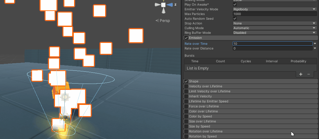 Shape 기능은 파티클이 어떤 방식으로 뻗어 나갈건지 결정하는 기능이다. Corn 모양일때 원뿔 모양에서 파티클이 뿜어져 나왔고 Donut일때는 사방으로 퍼져 나오는 모습을 볼 수있으며 퍼져나오는 근원의 위치,각도,크기를 조절 할 수 있다.