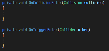 결론 : OnCollison() 메서드와 OnTrigger()메서드의 자동완성 인자값이 다르기에 실제로 사용할때 주의하여 사용하자