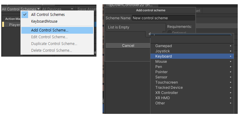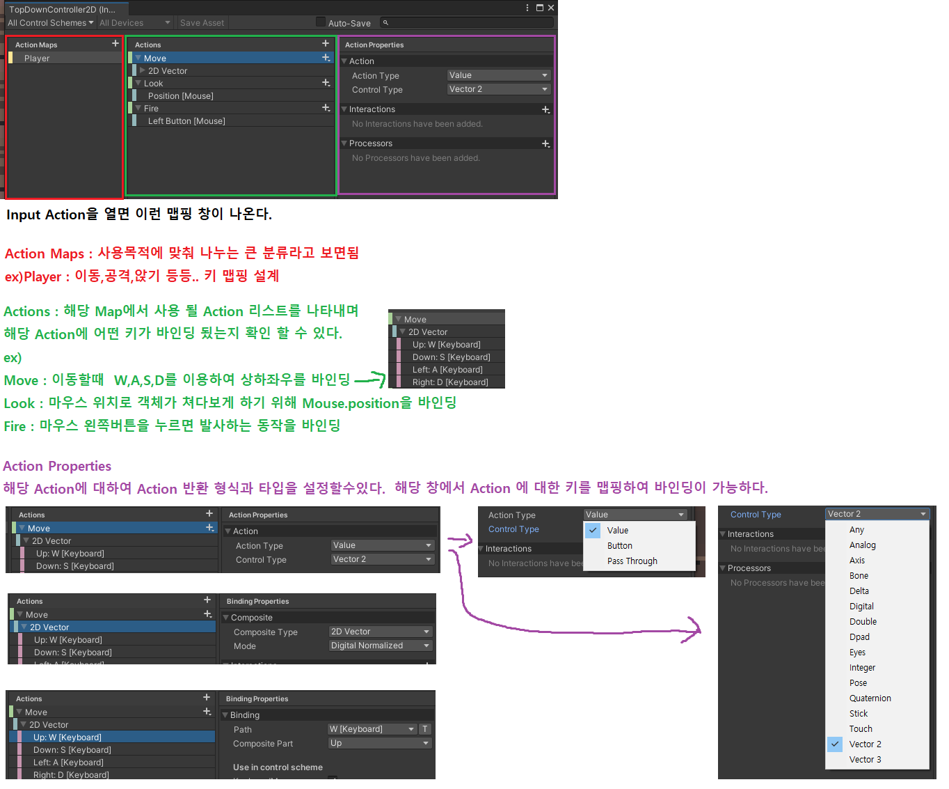 Input Action Asset : 여러 개의 입력 행동을 그룹화하는 방법, InputAction을 열면 설정창에서 ActionMaps,Actions,AcitonProperites를 수정할 수 있다.