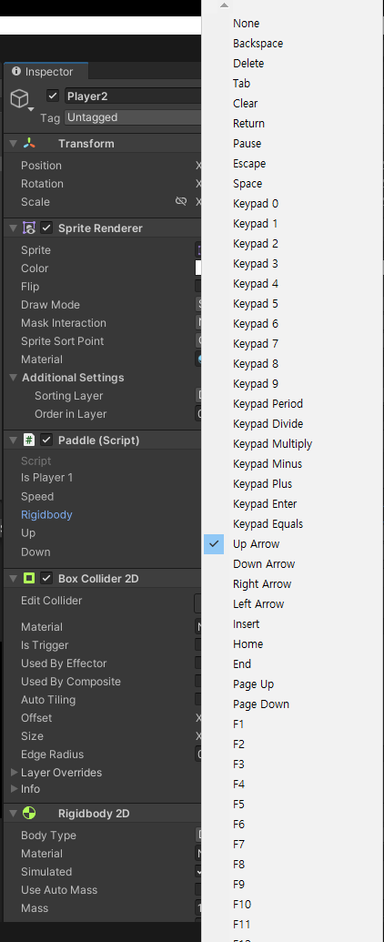 if(Input.GetKey(Down)) { movement -= 1f; }