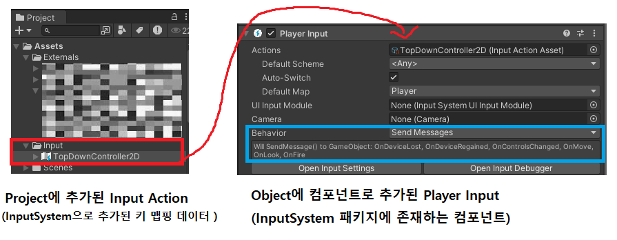 Player Input 컴포넌트 : 입력 행동을 받아 해당 게임오브젝트에 메시지로 전달해주는 역할