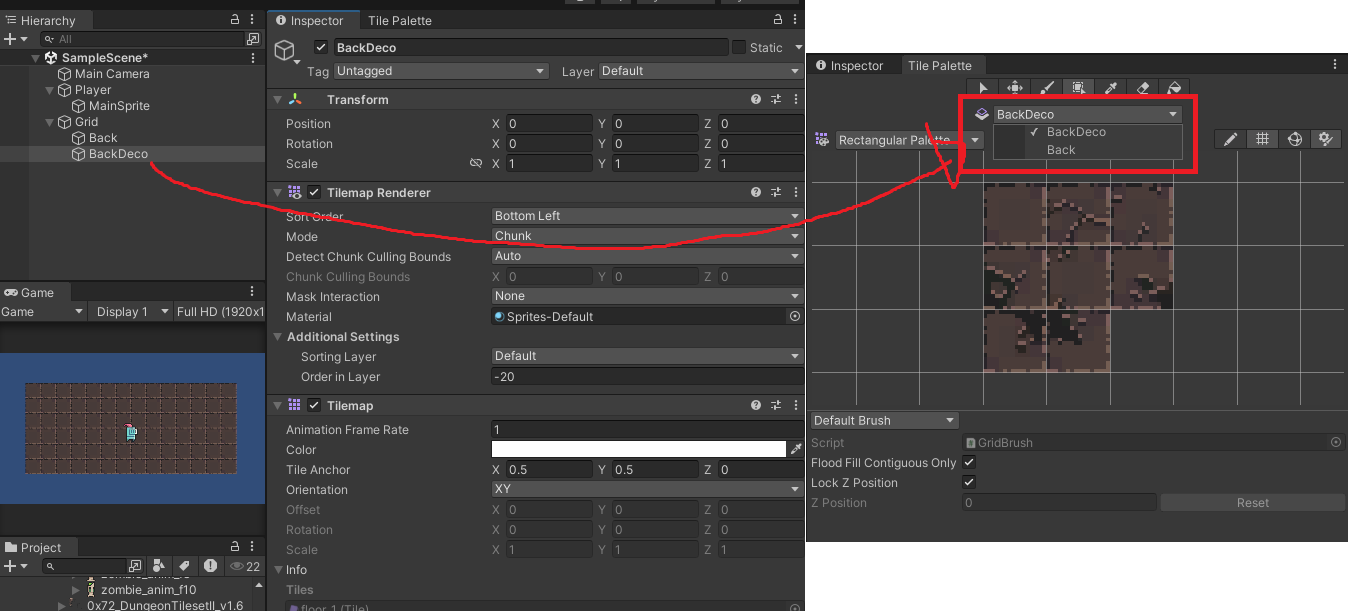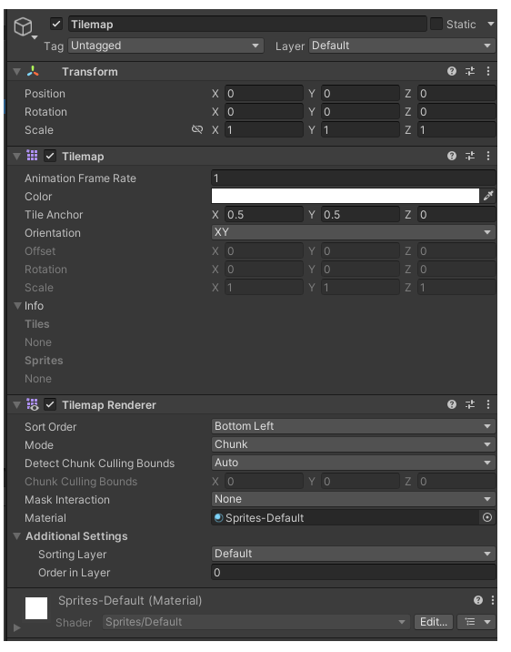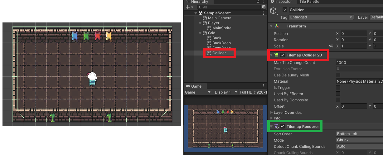 위의 Tilemap 오브젝트가 하나의 레이어 처럼 사용 될것이다.