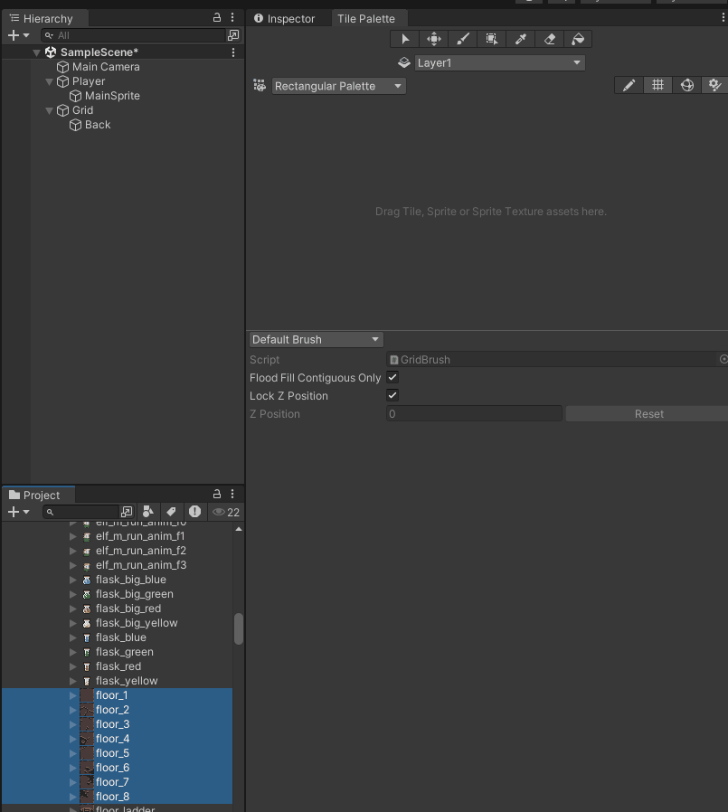 Tile Pallete를 생성 했으면 그 안에 스프라이트(물감)를 넣어야 된다.