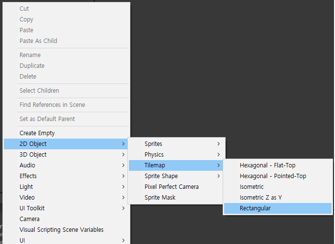 A.하이어라키 창 우클릭 - 2D Object - TileMap - 원하는 타일맵 선택(해당 글에서는 Rectangular)