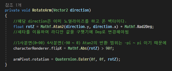 두 벡터의 거리(Vector2 direction)를 인자값으로 아크탄젠트를 이용하여 각도(rotZ)를 반환받은뒤