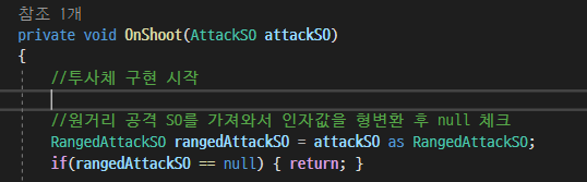 투사체를 발사하는 메서드인데 공격에 관련된 데이터를 ScriptableObject에 담아놔서 이렇게 꺼내 쓸수도 있다.