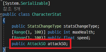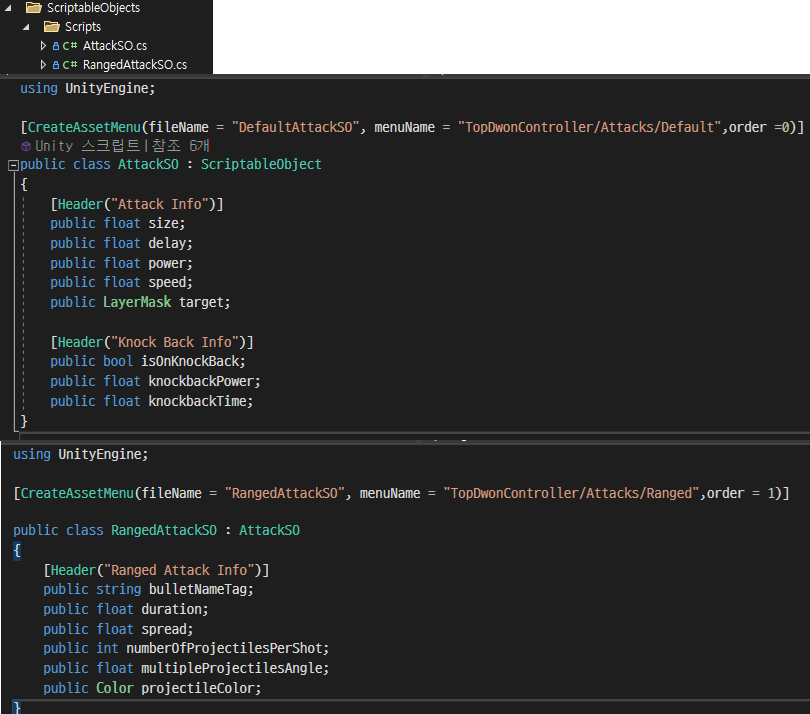 4. ScriptableObject Class 기반이기에 상속이 가능하다 ( RangedAttackSO는 AttackSO를 상속하고있다)