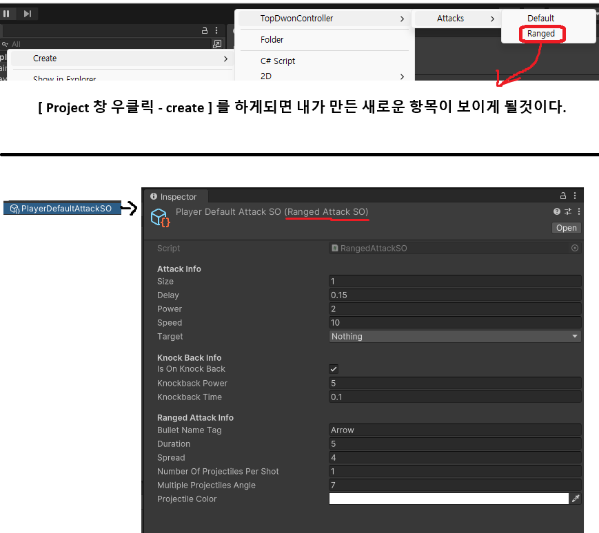 1.CreataAssetMenu 라는 Attribute 를 통해 포멧에 맞춰 작성해주어야 프로젝트 창에서 문제없이 호출하여 생성이 가능해진다.