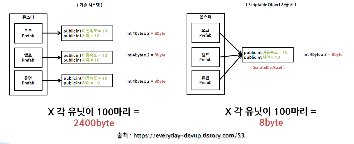 json,xml,csv 등으로 관리하던 데이터를 Unity에서 쉽게 사용 할 수 있도록 편의적인 기능으로 제공한 것이 ScriptableObject 이다.