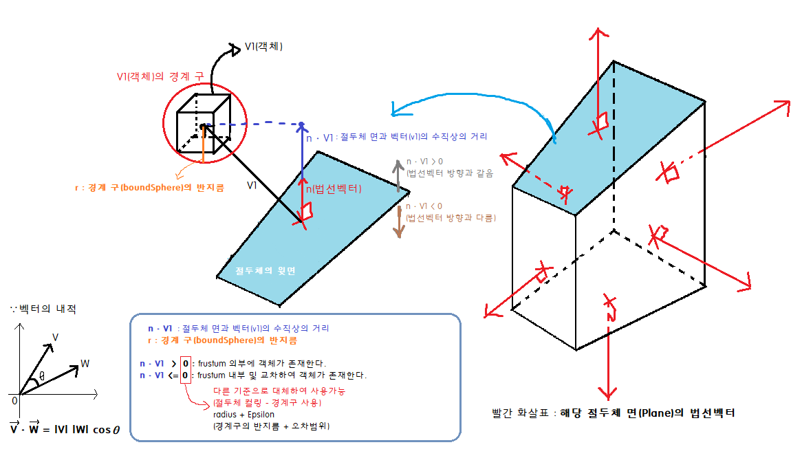 // 벡터의 내적(물체와 절두체 면의 수직상의 거리) > 물체의 경계(히트박스)거리 가 참인경우