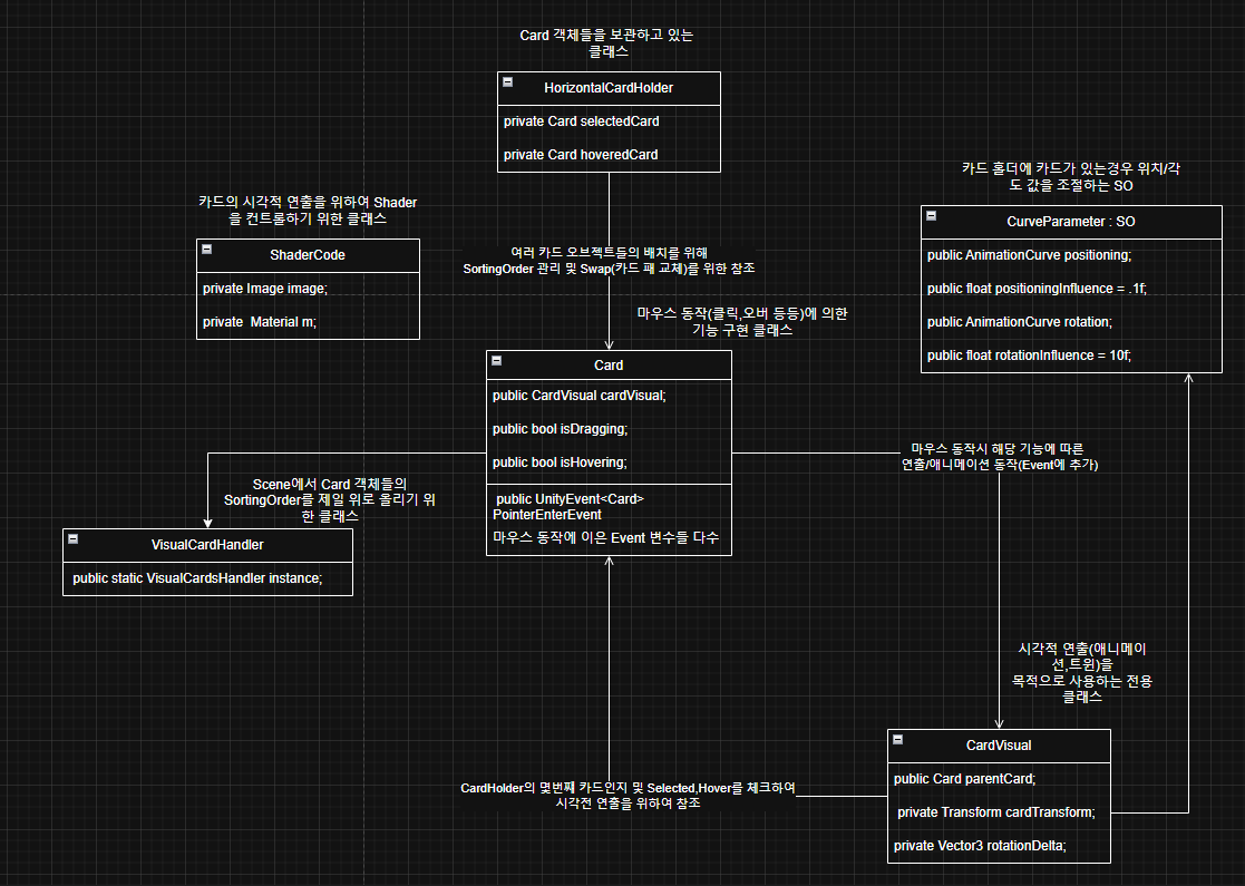 cardVisual은 카드의 시각적 관련하여 모든것을 관리(Dotween애니메이션 및 애니메이션에서 사용되는 수치들)